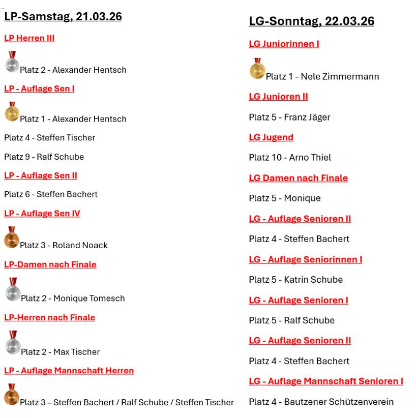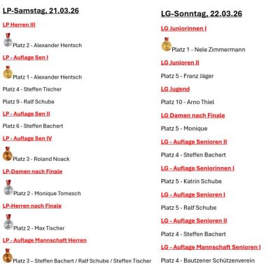 Die Feiertage waren kaum verklungen, da lag am 4. Januar 2026 bereits wieder Wettkampfatmosphäre in der Luft. In Oschatz, zum Schießen mit Musik, trafen sich alle bekannten Gesichter mit neuem Elan und großer Motivation wieder. Die Konzentration und auch die Nervosität waren von Beginn an spürbar. Es war wieder ein Tag voller Einsatz, Anspannung und kleiner persönlicher Erfolge. Letztes Jahr ging der wunderschöne Pokal in der Disziplin LG-A an Katrin, nach Bautzen,dieses Jahr ging er in der Disziplin LG nach Bautzen. Frau Moni hat sich sehr gefreut . Herzlichen Glückwunsch auch allen anderen Platzierten und Teilnehmern. Steffen und Monique belegten jeweils in LP-A und LP zudem Platz 2. Wir kommen nächstes Jahr auf jeden Fall wieder.